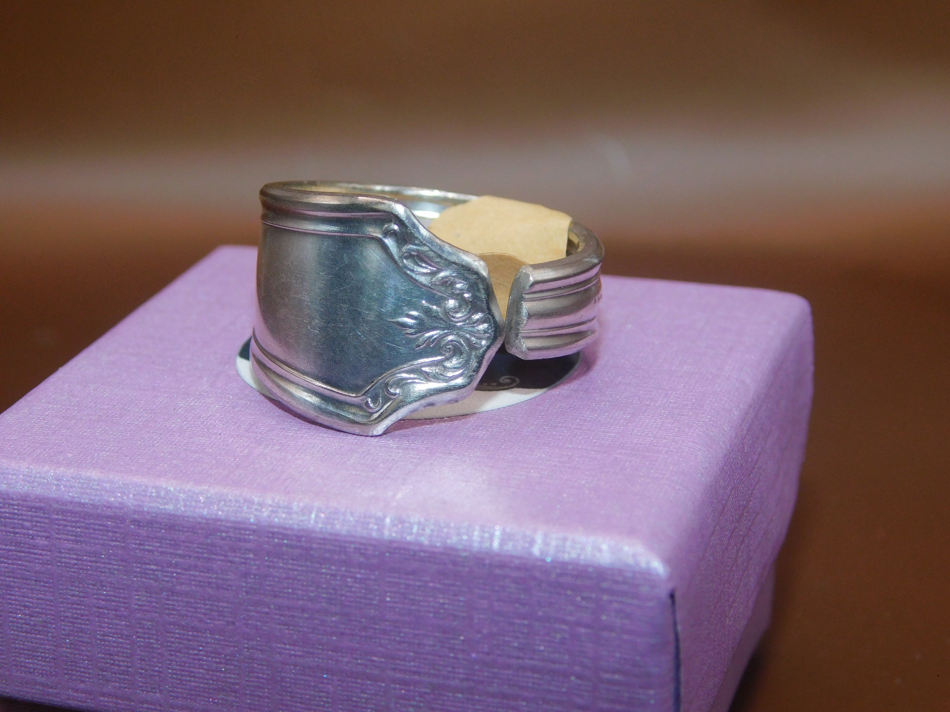 This silver-plated band-style ring, crafted from a repurposed spoon handle, combines elegance with sustainability. Its charming design offers a timeless accessory that transforms everyday silverware into a treasured piece of jewelry, perfect for those who appreciate both craftsmanship and history. Size 11