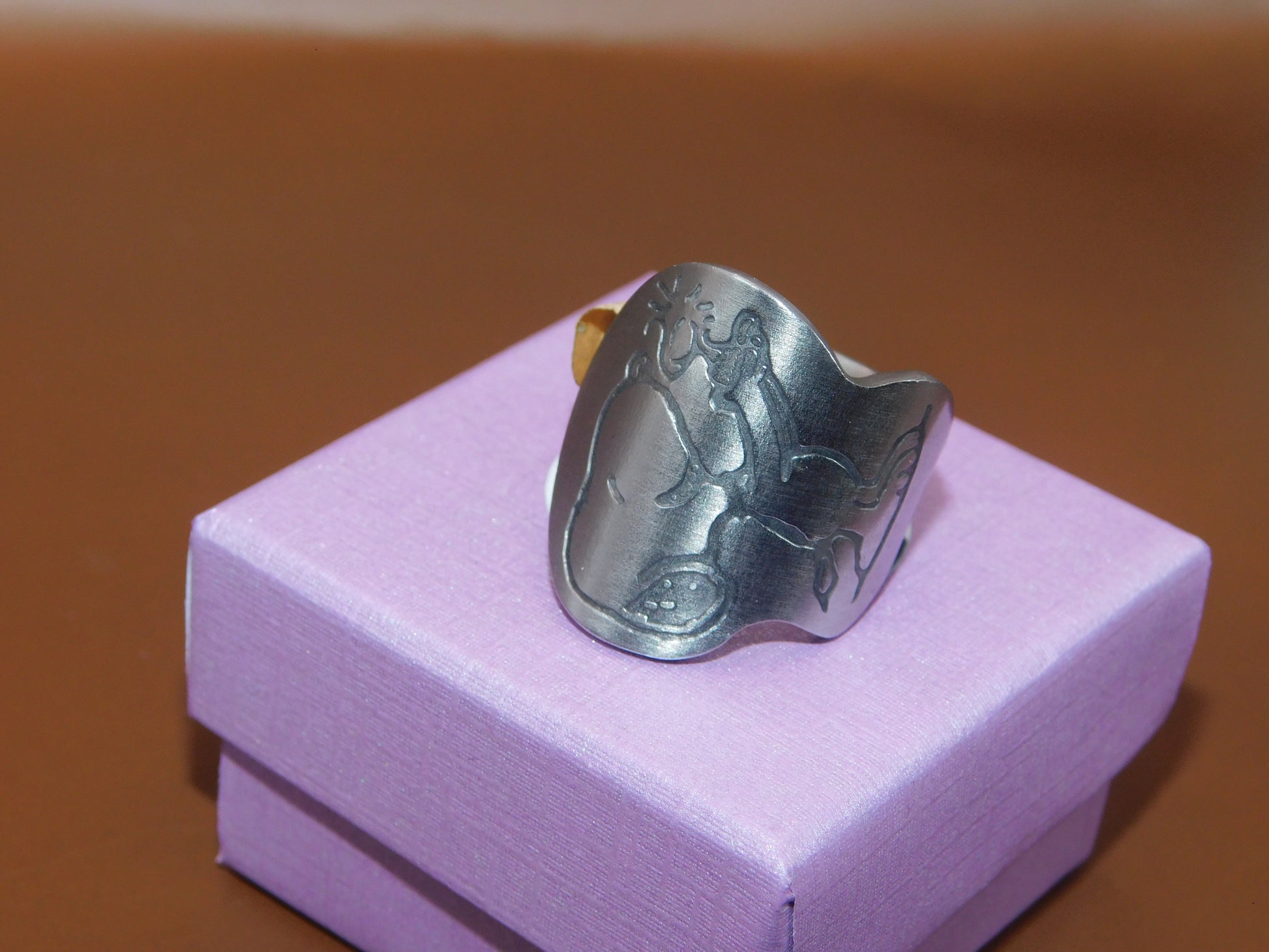 This exquisite ring features a vintage, repurposed spoon handle intricately designed with Snoopy, the beloved Peanuts character. A stunning collectible for fans and TV memorabilia enthusiasts, it combines nostalgia with unique craftsmanship. Perfect for those who appreciate timeless charm and iconic pop culture, this piece celebrates Snoopy’s enduring appeal in a beautiful, wearable form. Size 9.