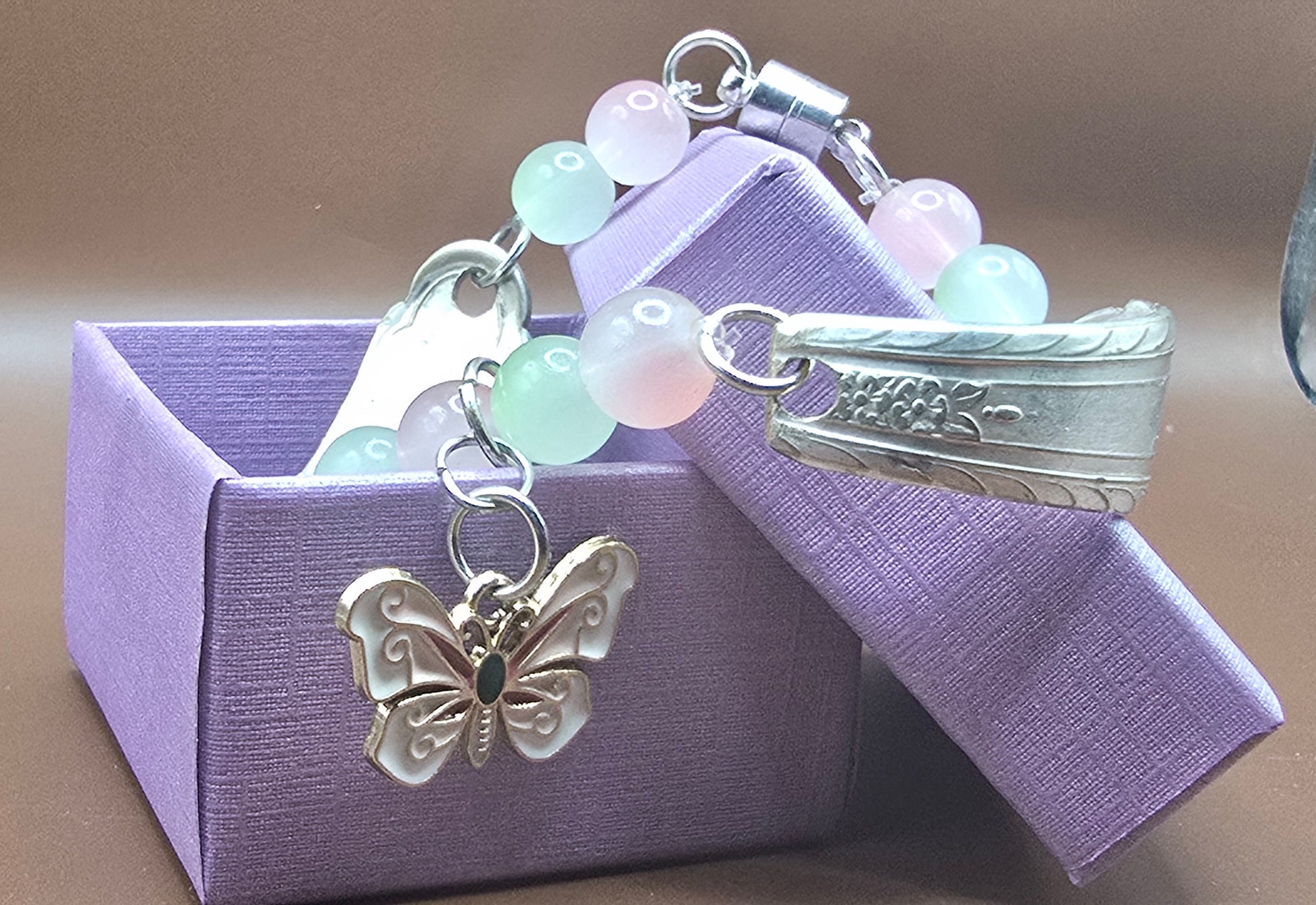 Handmade with a vintage repurposed spoon handle, this bracelet is truly one-of-a-kind. The magnetic clasp ensures a secure fit while the butterfly charm adds a whimsical touch. Each bracelet is unique and eco-friendly, making it a perfect addition to any jewelry collection.