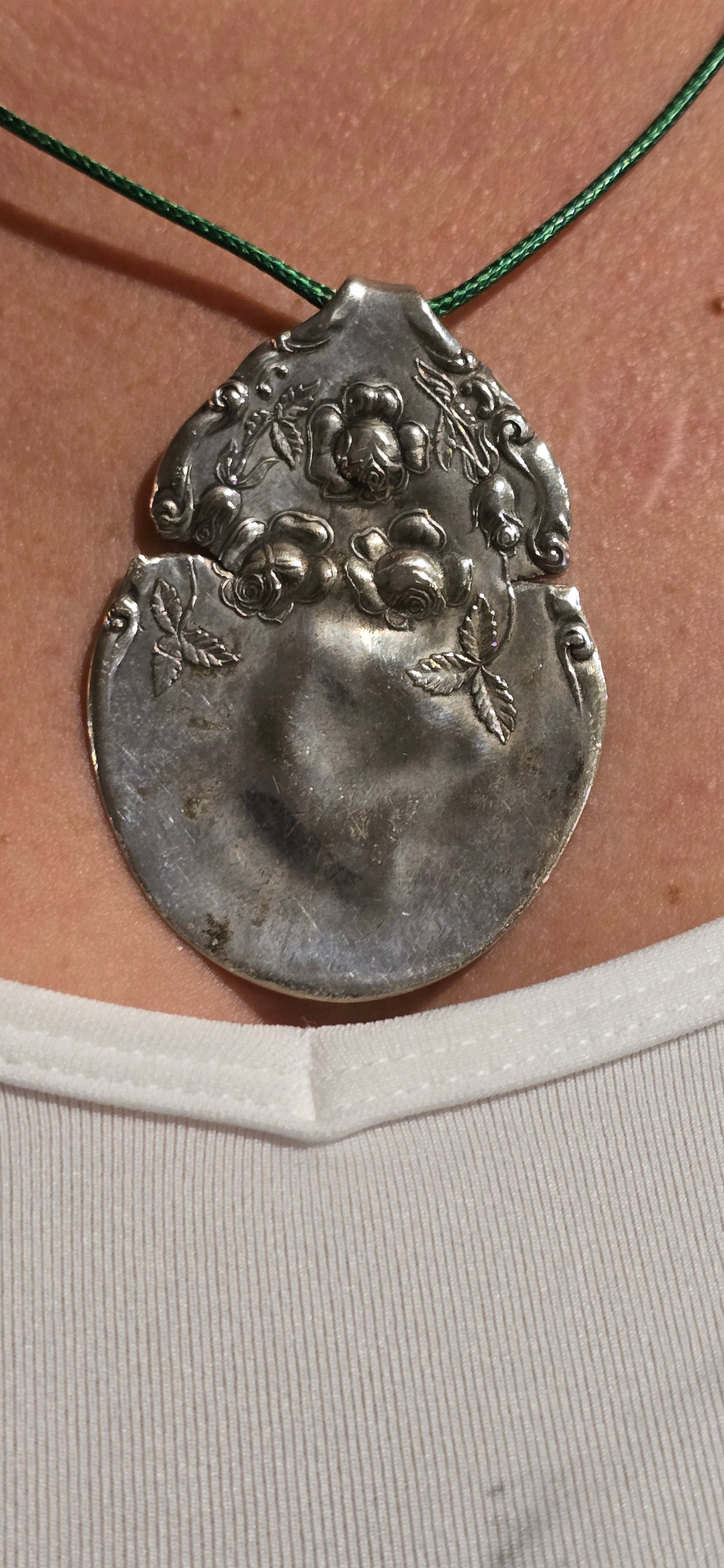 Crafted from a repurposed vintage spoon bowl, this one-of-a-kind silverplated necklace pendant adds a touch of antique charm to any outfit. With its stunning design and unique history, it's the perfect accessory for any fashion-forward individual. Own a piece of the past with this sunning necklace pendant.