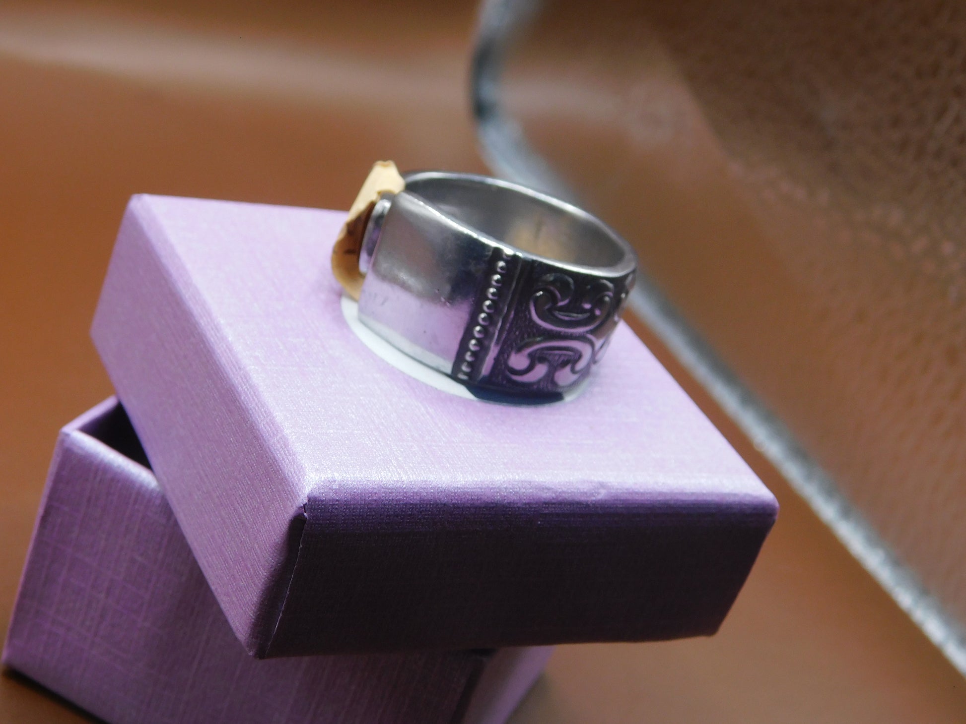 Crafted from a carefully repurposed vintage spoon, this stainless steel piece transforms everyday utility into exquisite fashion. Its sleek, elegant design stands out as a one-of-a-kind treasure, seamlessly transitioning from your table to a statement accessory. This eye-catching creation blends sophistication with sustainability, making it a unique addition to any collection or outfit. Size 11.5