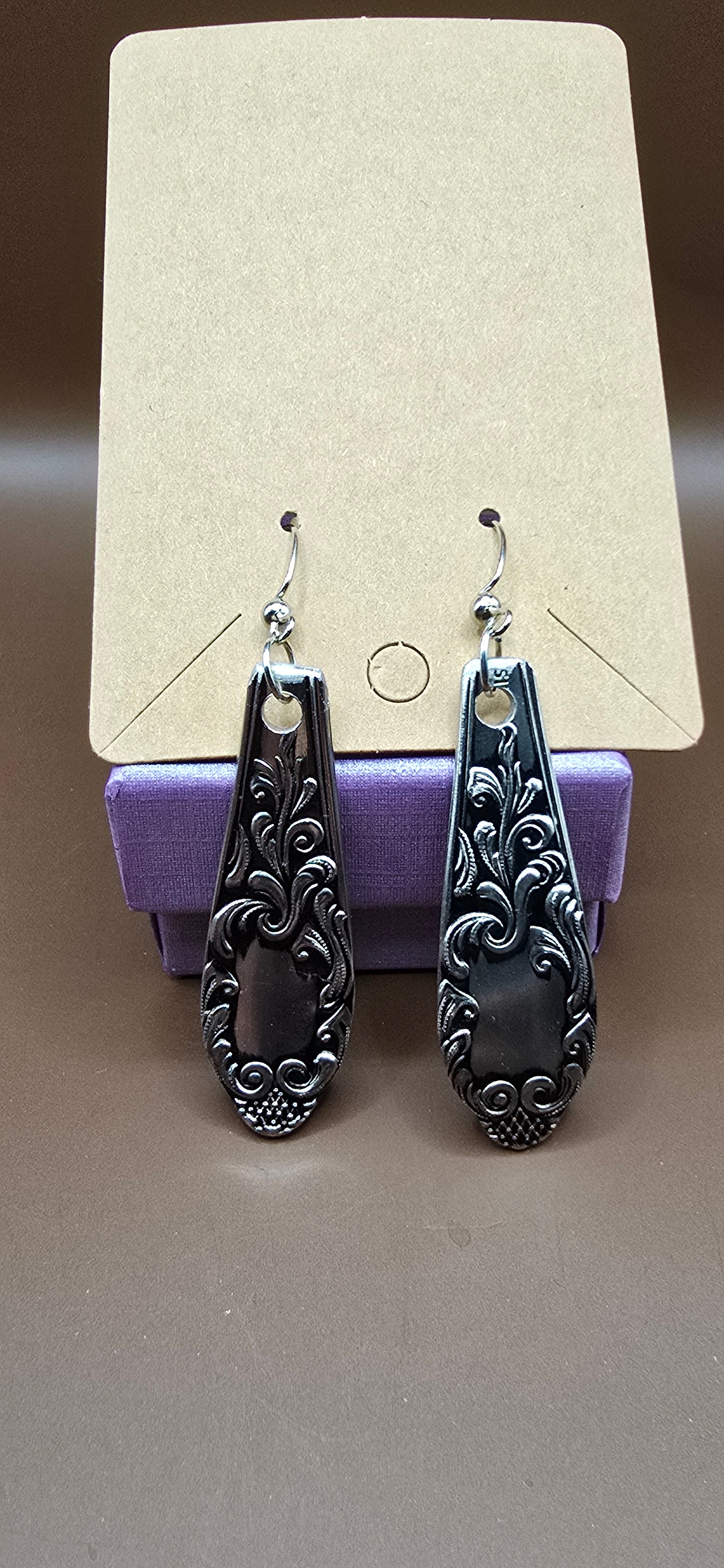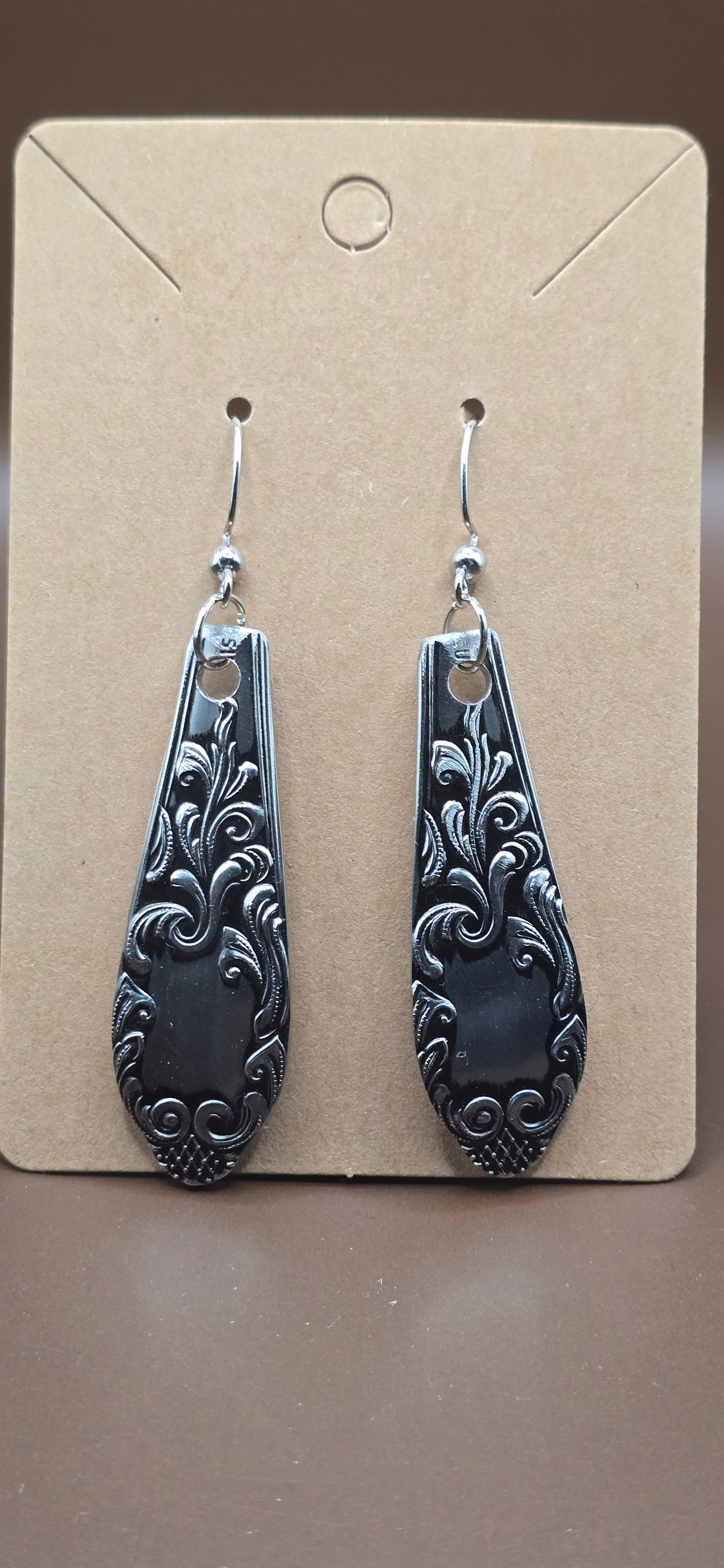 Crafted from vintage silver plated spoon handles, these repurposed earrings are a unique addition to any jewelry collection. Handmade and one-of-a-kind, they bring a touch of history and sustainability to your style. Elevate your look with these timeless and environmentally-friendly accessories.